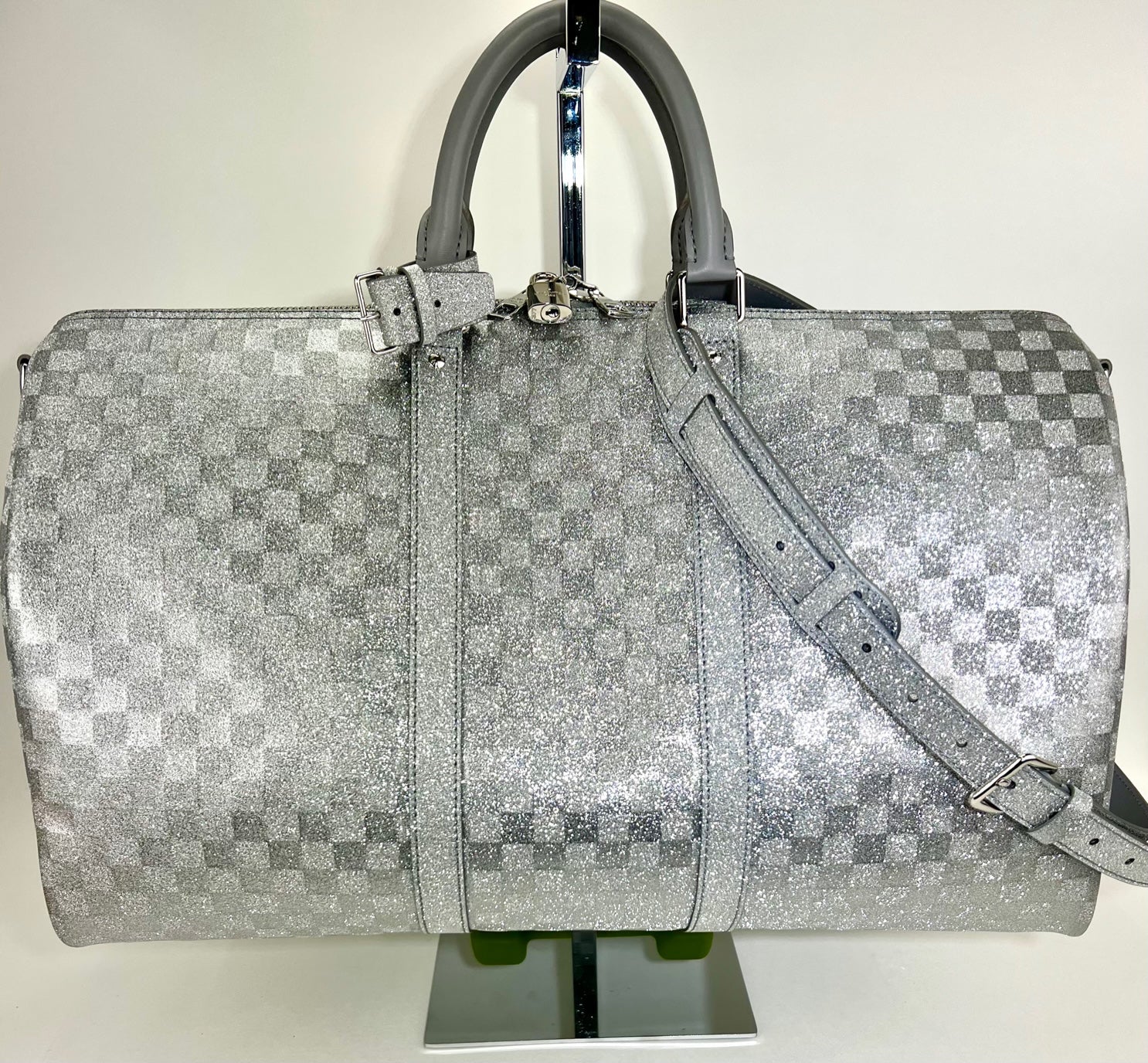 Louis Vuitton Keepall Bandoulière 50B Silver Glitter Damier Pattern Duffle Bag Preowned